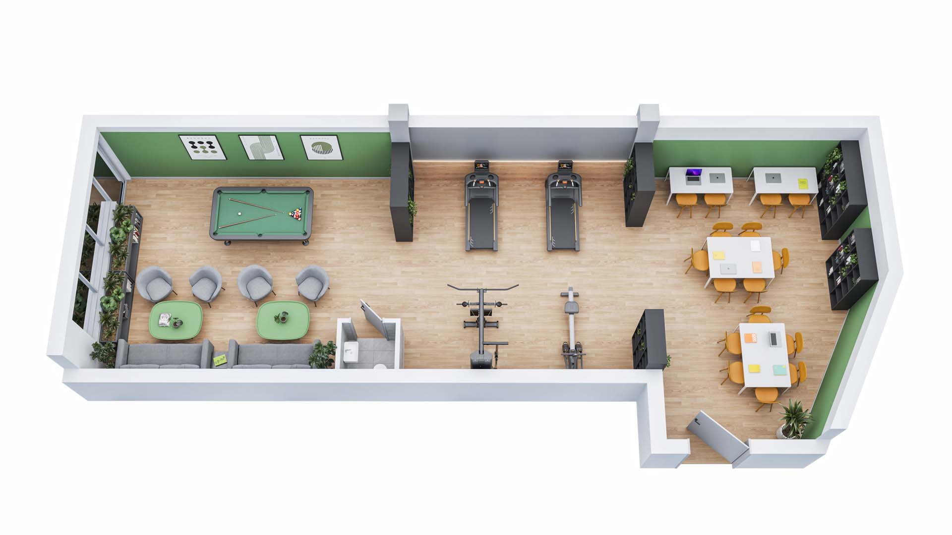 Beyond residential properties, 3D floor plans are an excellent tool for commercial, office, and retail projects. They clearly display all key facilities, circulation paths, and spatial relationships, communicating perfectly how the overall layout functions.