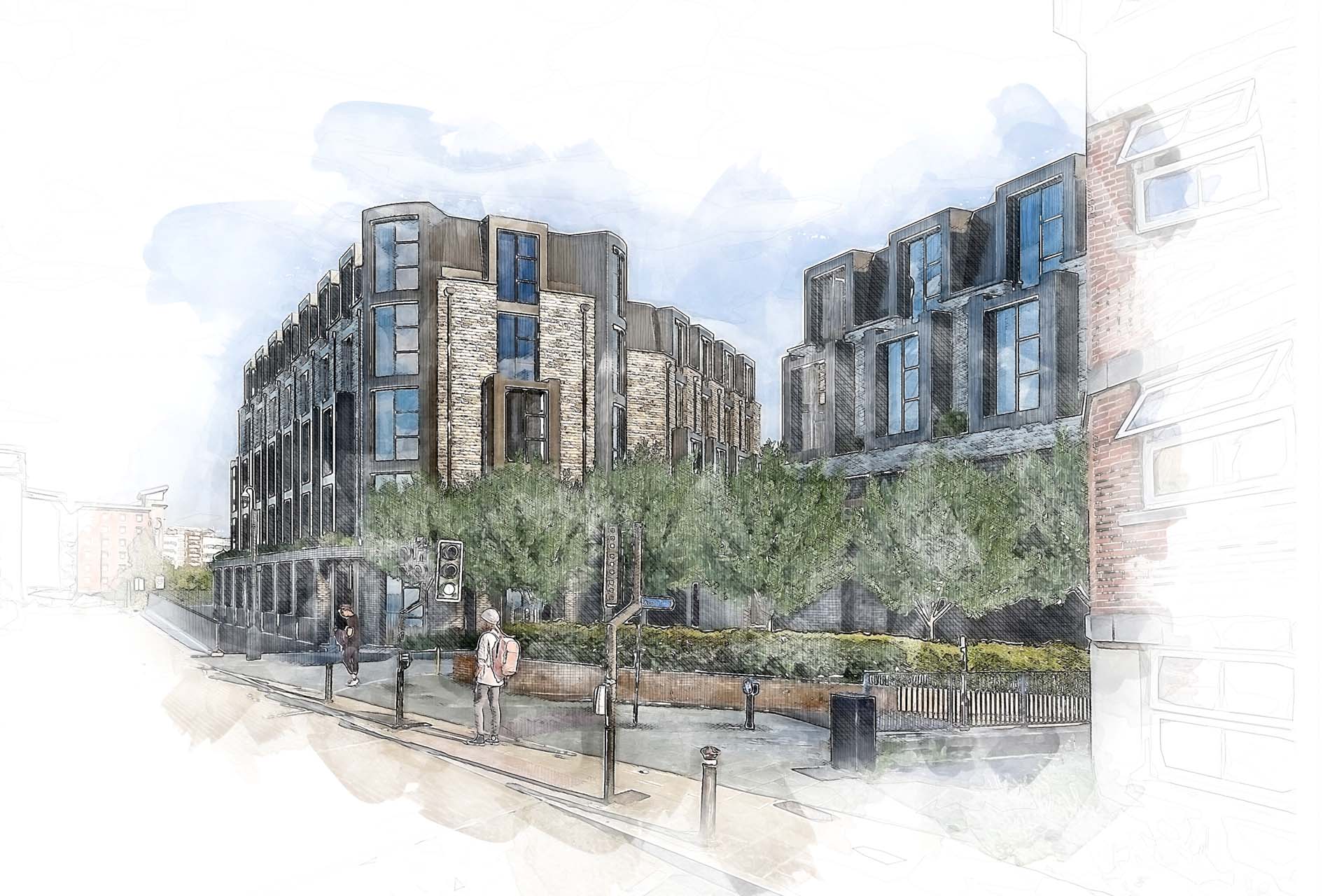 Watercolour sketch style renders are particularly suited to projects that are in the early planning stages, where finer points to the architecture haven’t been finalised, and a general overview is more appropriate, allowing interested parties to be able to get a feel of the atmosphere without focussing on details. Our watercolour images give a scheme a more artistic, human touch, bringing the design to life in a unique way.